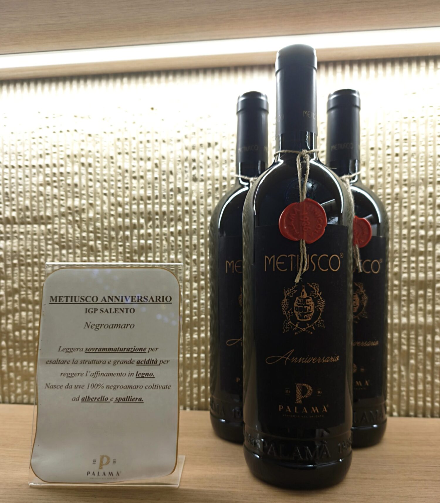 “METIUSCO ANNIVERSARIO” Rosso Salento IGP di Vinicola Palamà: Un’etichetta speciale creata per celebrare i 25 anni della storica linea Metiusco. È un **Negroamaro 100%** ottenuto da uve di **vigne di 50-70 anni** allevate ad alberello. L’affinamento di 9 mesi in barrique di secondo e terzo passaggio conferisce a questo rosso un profilo intenso, succoso, caldo e avvolgente, con un caratteristico finale amarognolo.